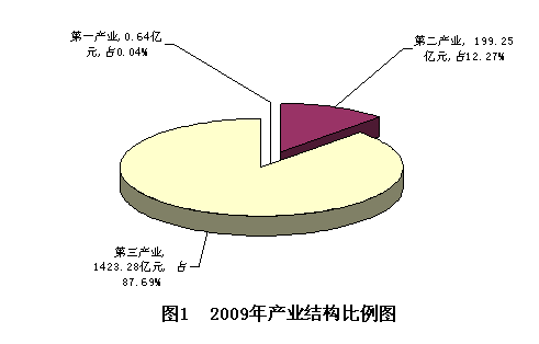 (一)保增长情况。全年GDP1623.17亿元,同比增长10.1%;规模以上工业增加值165.41亿元,完成103.4%;社会固定资产投资168.34亿元,增长5.1%;社会消费品零售总额800.18亿元,增长15.2%;出口总额293.36亿美元,完成101.2%,外商直接投资10亿美元,增长9.9%;辖区税收430亿元,增长6.7%;地方预算内财政收入46.70亿元,增长10.4%;三次产业结构比例为0.04:11.27:87.69,生产性服务业占第三产业72.3%;单位GDP建设用地下降9.2%,万元GDP水耗下降7.2%、电耗下降5.6%;GDP地均集约度20.80亿元/平方公里,税收地均集约度5.51亿元/平方公里。