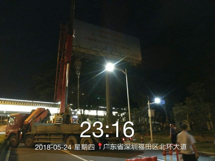 在福田交警的大力支持下,4名交警同志现场配合道路交通疏导工作。梅林街道执法队执法人员4名,协管人员10名,专业施工人员40名,动用大型吊机1辆,大型运输车3台等。在经过7.5个小时的拆除后,位于北环路梅林立交北侧绿化带上的大型户外立柱广告被安全拆除。