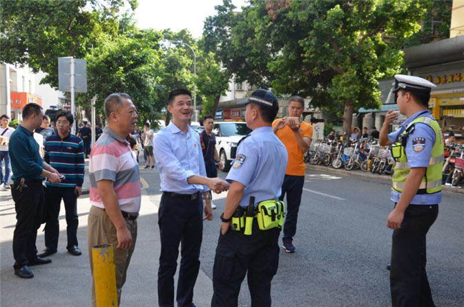 10月18日下午,南园街道党工委副书记戴海东、委员李建中率综治办、司法所负责人巡查华强南片区综合整治工作,重点检查了华强南周边交通秩序和环境整治情况,慰问了一线执勤的特警、交警、城管执法队员及社区工作站同志。海东副书记对执勤人员坚守岗位、履职尽责表示充分肯定,要求执勤人员提高政治站位,强化政治担当,增强政治定力,充分发扬吃苦耐劳和顽强拼搏精神, 以高度的责任感和使命感,全力做好综合整治工作,为党的十九大胜利召开创造安全和谐的良好氛围。(综治办 锡东波)