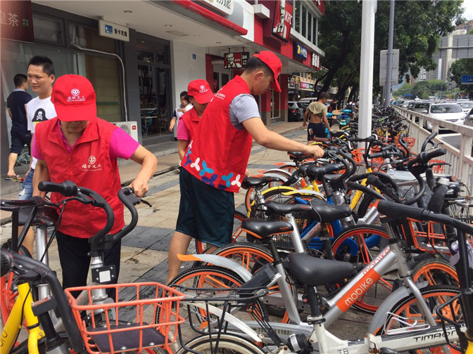 园西社区义工队开展共享单车有序摆放活动,义工们用切身行动来树立创建文明城市的正向影响