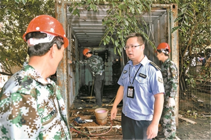 6月12日,台风“苗柏”登陆深圳,全市各区暴雨连连。在上步码头,一个20余平方米的集装箱里,一家三口的饮食起居都在其中,存在重大安全隐患。暴雨中,一位穿着制服的身影来回穿梭,有条不紊地指挥居住人员撤离。